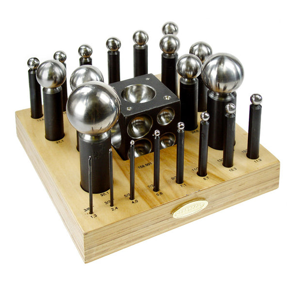 - 23 Piece Set Includes: 21 - Individual Matching Punches; 1 - Dapping Cube; 1- Wooden Base