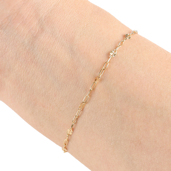 Each section of this chain is meticulously crafted with three sleek paperclip links, offering a contemporary and refined foundation. These minimalist links gracefully connect to a stunning mini sunburst disc, expertly hammered to create a beautiful texture that catches the light with every movement. Experience the effortless luxury of permanent jewelry that symbolizes connection, light, and enduring style. Perfect for wrists, ankles, or necklaces, our custom sizing ensures a comfortable and personalized fit that you'll cherish.