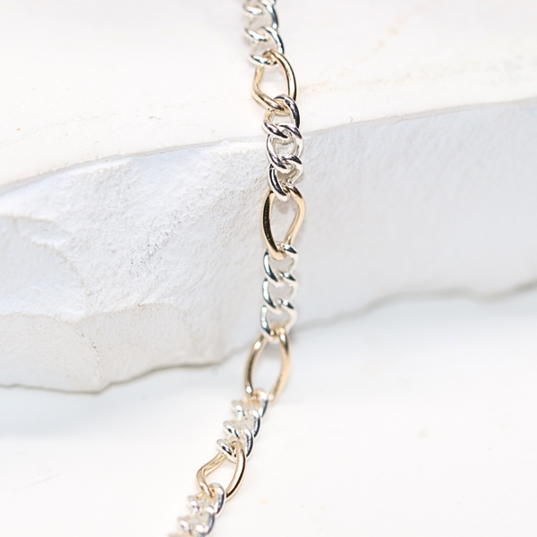 One of the most popular chains of the year, mixed metals manufactured from high quality gold fill wire and sterling wire. The large link in the figaro is a gold fill link, followed by 3 sterling silver links and repeating. This is available only in very limited quantities and exclusively through Pepetools