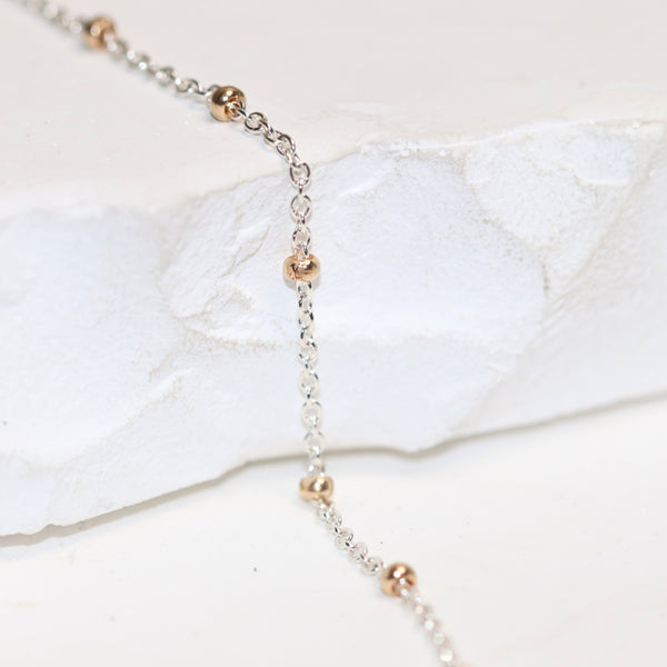 Crafted from shimmering sterling silver cable chain, each strand provides a classic, graceful base. What makes this chain truly exceptional is the addition of exquisite 1.7mm gold-filled beads, precisely spaced every 10mm along the length. These radiant golden beads catch the light, creating a beautiful contrast against the cool silver and adding a touch of unexpected luxury.