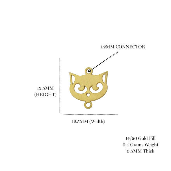 Description: This is a distinctive, gold-filled cat face connector, perfect for permanent jewelry designs. It measures 13.5mm in height and 12.5mm in width, with a thickness of 0.5mm and a weight of 0.4 grams. It includes a 1.2mm connector at the top for strong attachment to a chain.